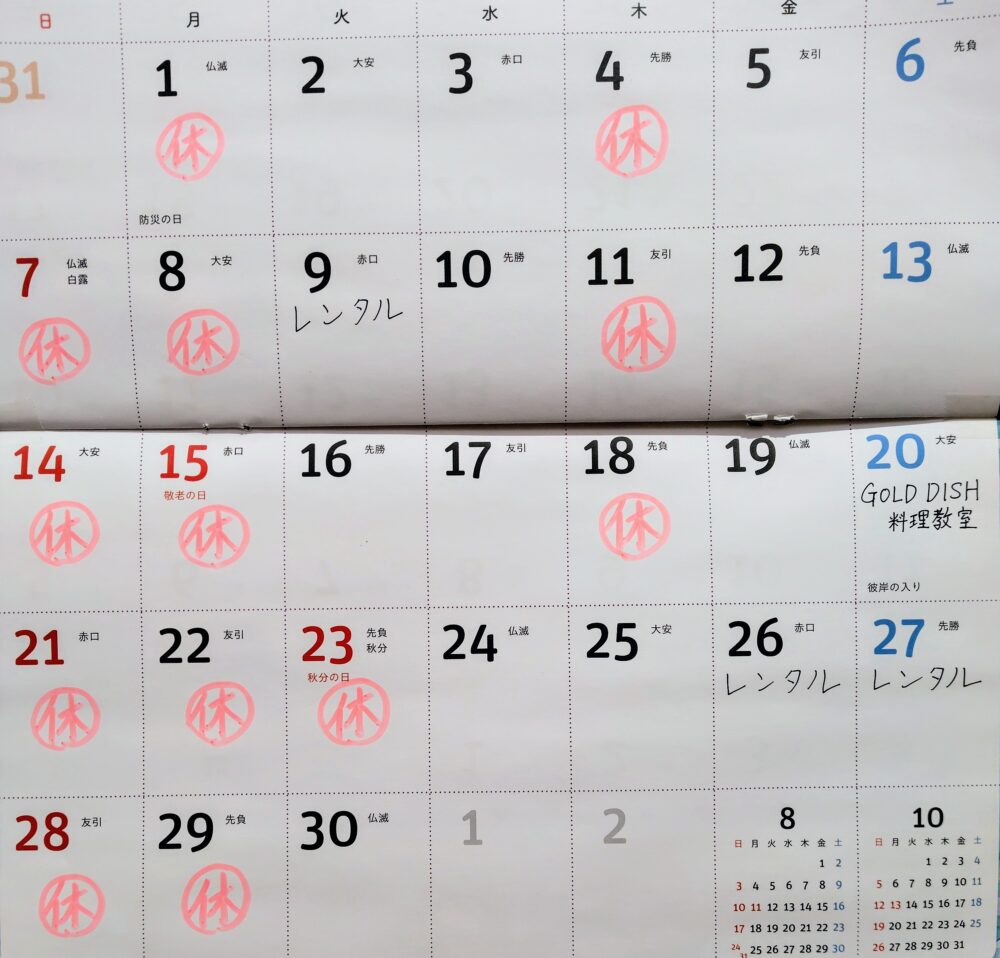 9月の営業日とお料理教室の日程をお知らせいたします。