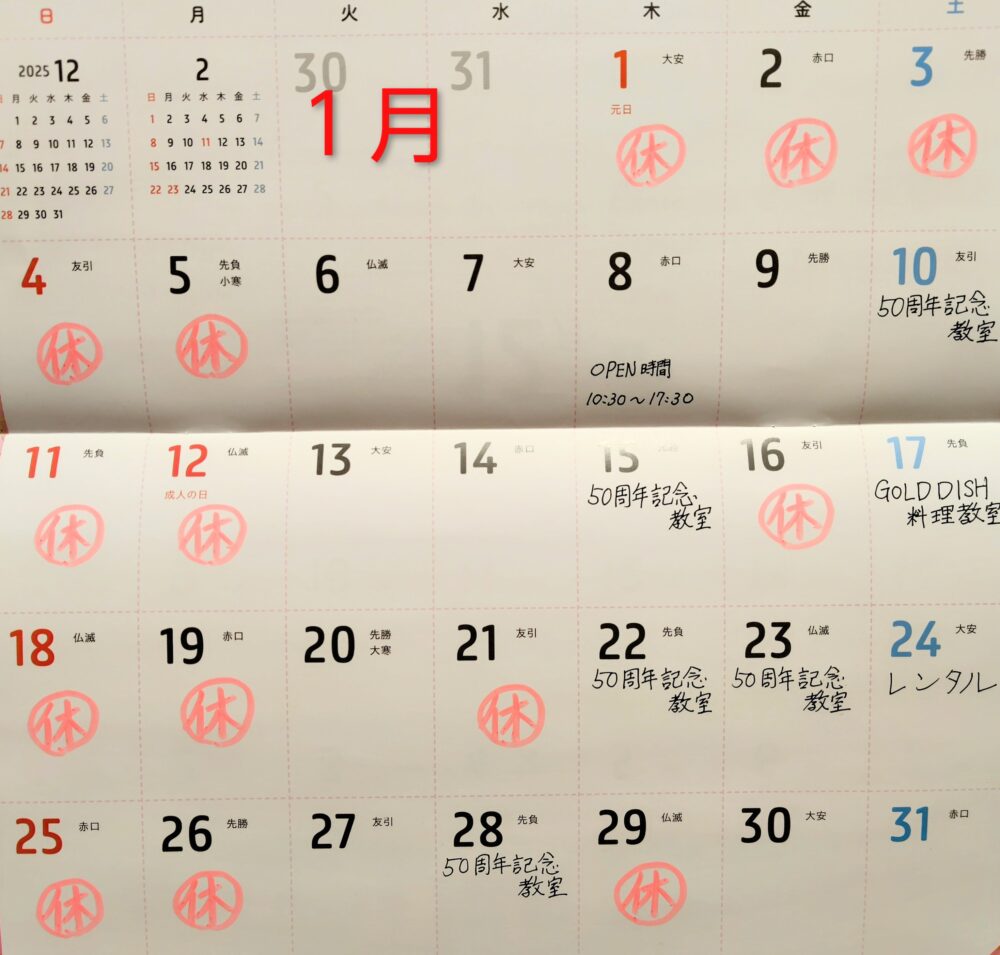 1月の営業日とお料理教室の日程についてお知らせいたします。