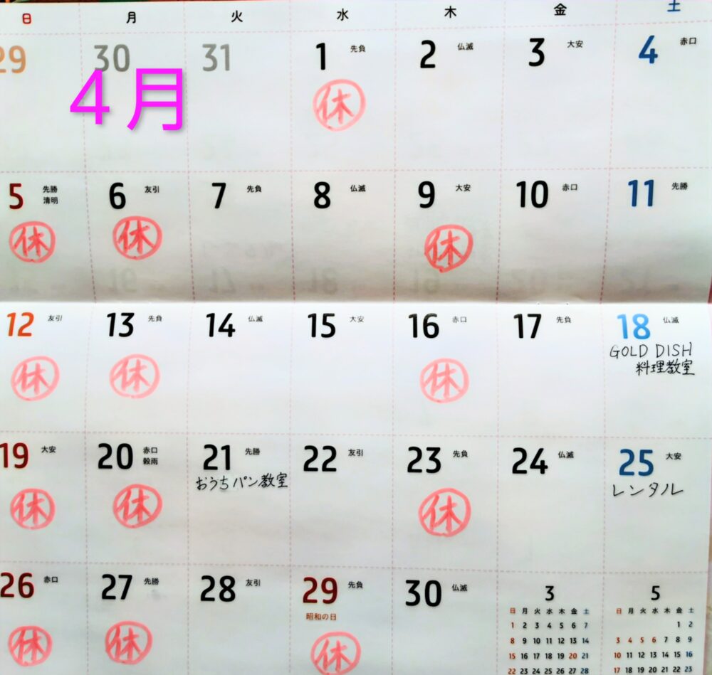 4月の営業日とお料理教室日程のお知らせをいたします。
