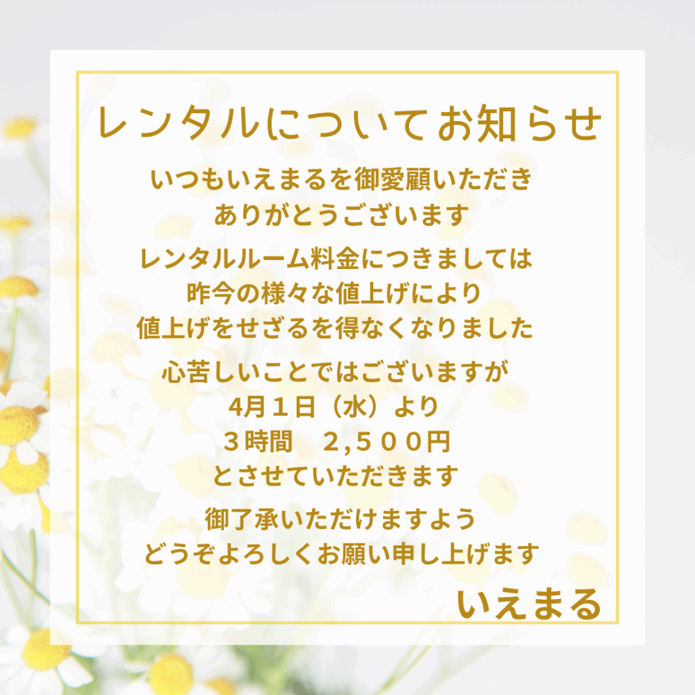 それから、大変申し訳ございませんが、4月よりレンタルルームの料金改定もお知らせ申し上げます。
